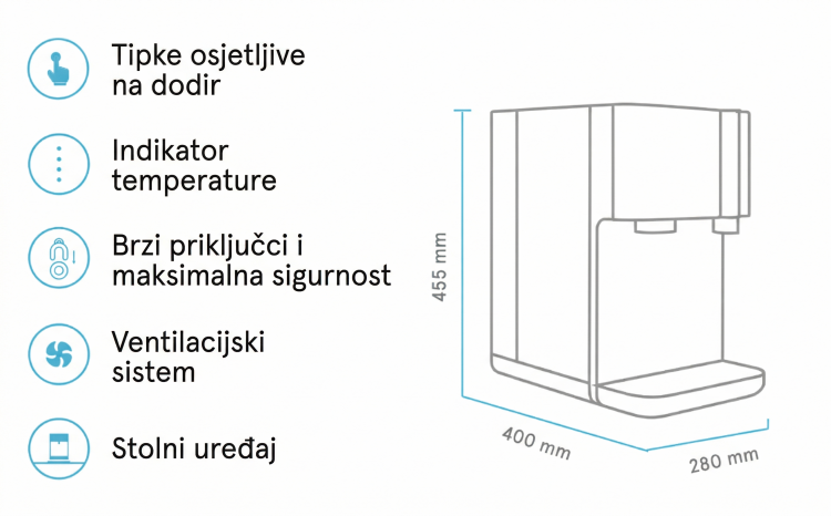 Ovaj aparat za vodu ima 4 stupnja filtracije i otklanja 99% nečistoća iz vode kao što su mehaničke nečistoće, klor, kamenac, teški metali, virusi i bakterije. Osim što filtrira vodu, ona je i hladi i zagrijava. Jednim pritiskom imate vruću vodu za kavu i čaj ili ledeno hladnu za napitak po želji, kao i vodu sobne temperature. Dodatno, postoji mogućnost odabira 4 različite temperature vruće vode i 4 različite količine vode.