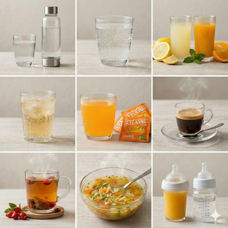 Obična voda ili gazirana (hladna ili sobne temperature), višekratne boce napunjene vašom filtriranom vodom, prirodni sokovi, gazirani sokovi, energetski napitci, kava, čaj, topli napitci (juhe), dječja hrana, dječji napitci i svježa i čista voda...