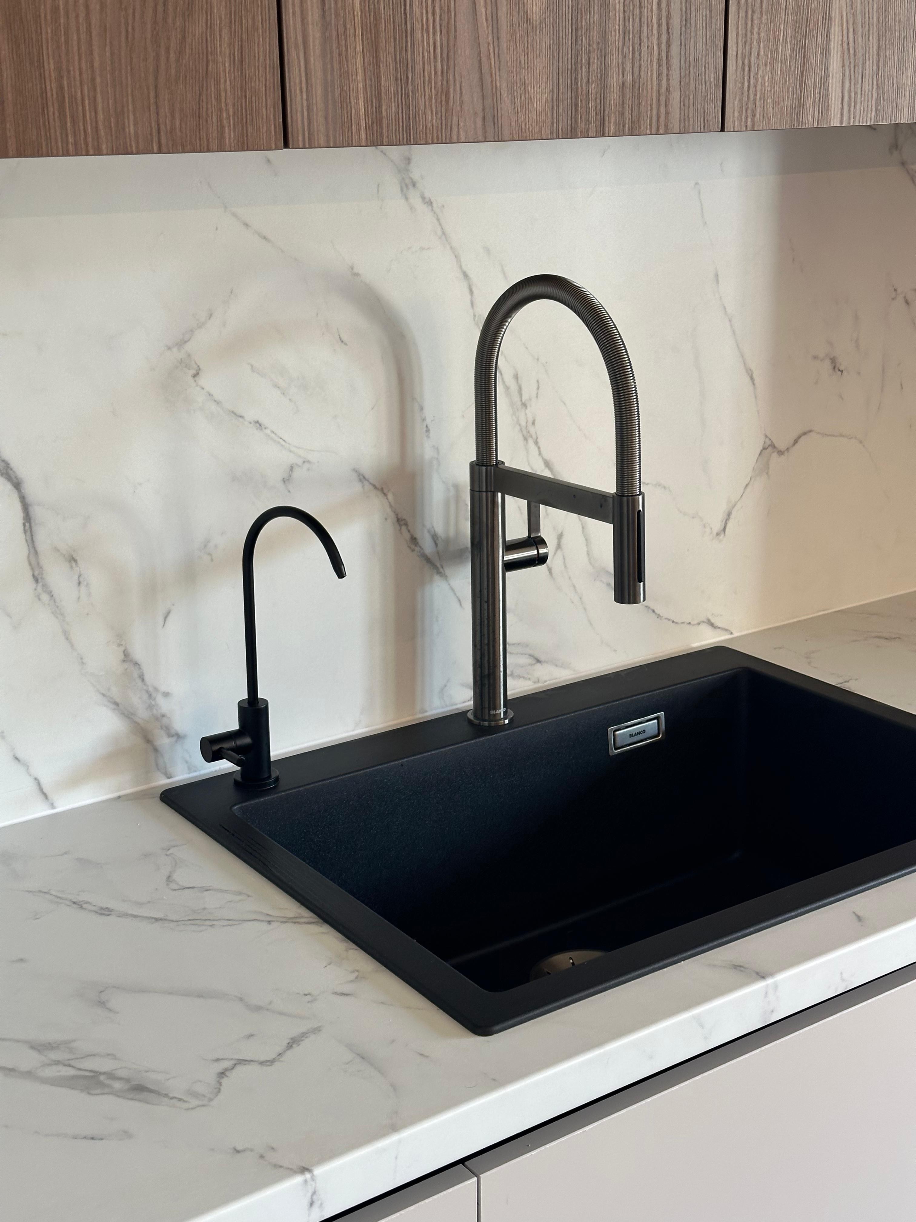 Crna, mat slavina modernog dizajna savršeno se uklapa uz vaš RO5 Premium filter vode, pružajući elegantan i funkcionalan dodatak vašoj kuhinji. Izrađena od kvalitetnih materijala, garantuje dugotrajnost i otpornost na koroziju, dok njen minimalistički izgled dodaje sofisticiranost vašem prostoru. Idealna za filtriranu vodu, ova slavina omogućava praktično i higijensko korištenje.