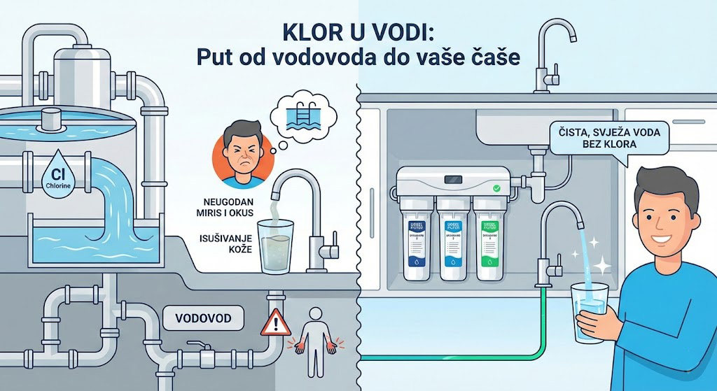 Iako su razine klora u gradskoj vodi kontrolirane, dugotrajna izloženost nusproduktima kloriranja (poput trihalometana) predmet je brojnih istraživanja u kontekstu očuvanja zdravlja. Osim toga, klor može negativno utjecati na osjetljivu kožu i kosu, uzrokujući isušivanje i iritacije. Mnogi se stoga odlučuju na završnu filtraciju na samom mjestu potrošnje kako bi bili potpuno sigurni u kvalitetu onoga što unose u svoj organizam.