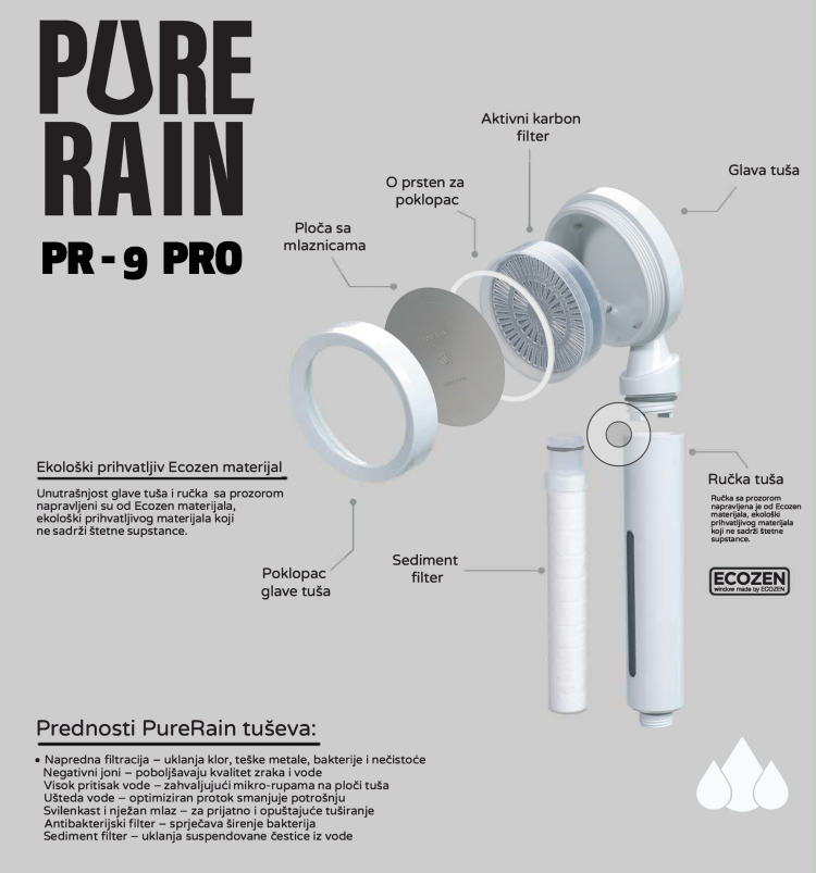 Zdrava koža ne ovisi samo o kozmetici koju koristite – već i o vodi koja je svakodnevno dodiruje. Klor i mehaničke nečistoće iz vodovodne mreže često su skriveni uzrok suhoće, iritacija i narušene zaštitne barijere kože. Upravo zato PR 9 PRO tuš ručica donosi konkretno rješenje tamo gdje je najpotrebnije – direktno pod tušem.